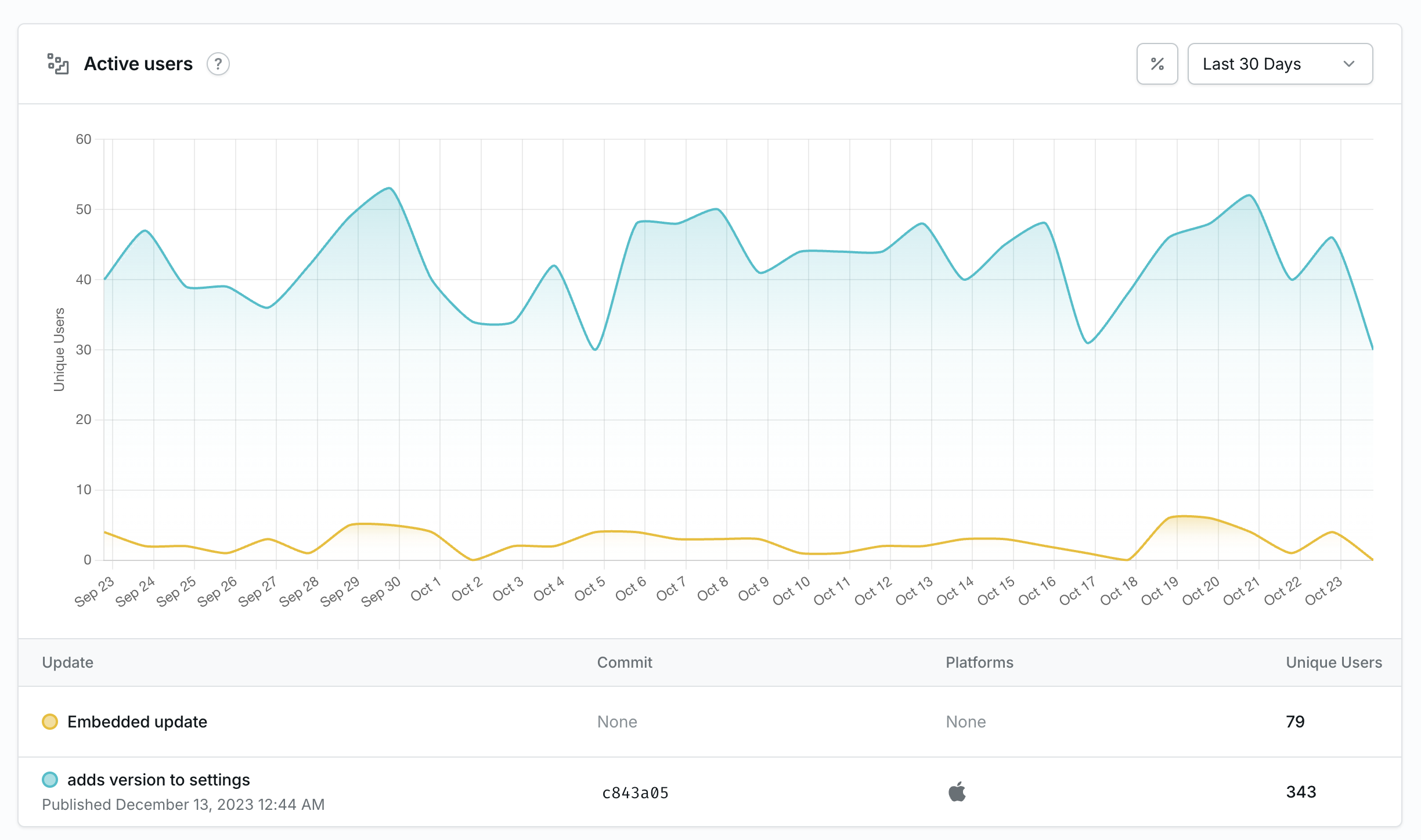 Expo provides the expo-insights library, which tracks information related to EAS Update. This data includes the app version, platform, OS version, and update adoption. After you install it and release production builds on the app stores, you'll be able to see additional data on your project dashboard: